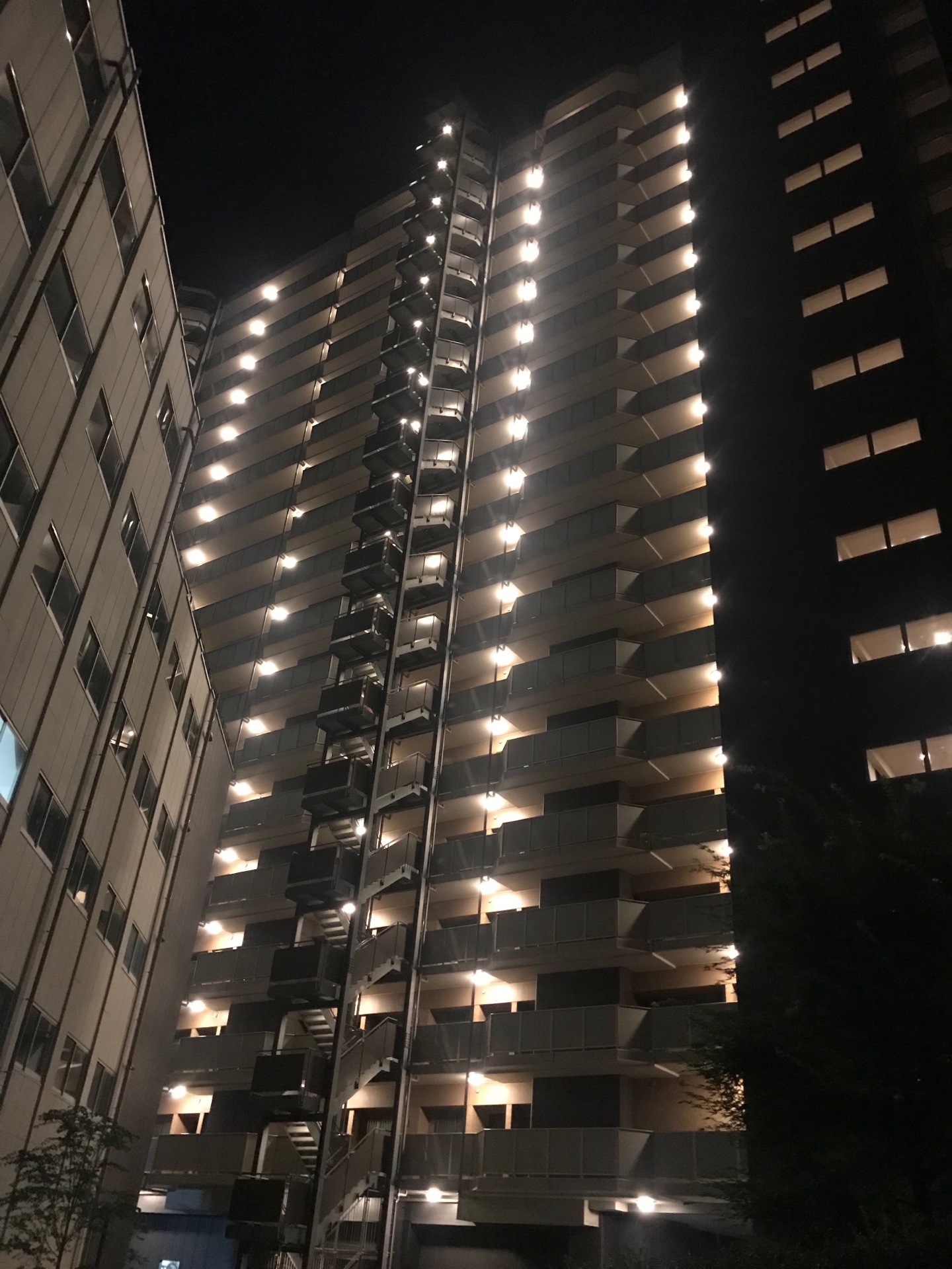外廊下があるA棟の外灯と内廊下のB棟の廊下の電気をLEDに変更しました。