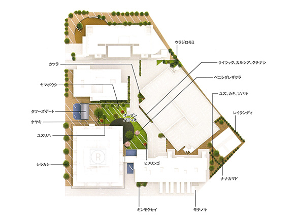 先進のマンション設備・環境だけでは、心からのゆとり、贅沢感は味わえません。アップルタワーズ<仙台>では、さらに上質は住環境を実現するために、四季の美しい移ろいを映す様々な樹種の植栽プランを導入。さわやかな太陽をかんじながら緑のそよぎに心和ませるパティオ(中庭)を設けるなど、快適な住環境を創造するランドデザインを採用しています。